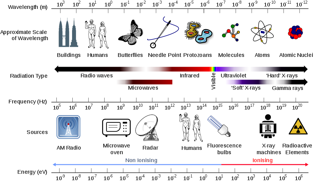The spectrum of electromagnetic waves and their common sources (Credits: Wikimedia Commons)